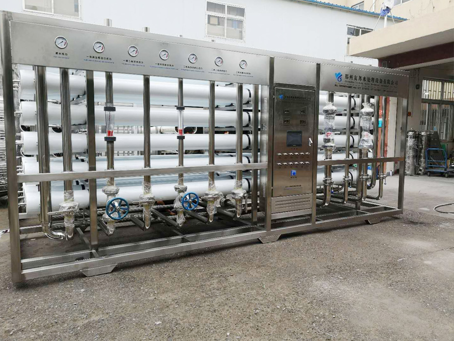 原水→增壓泵(一用一備)→砂過濾器→炭過濾器→硬化器(根據地區不合選用)→精密過濾器→兩頭水箱→RO前水泵→精密過濾器→RO高壓泵→RO反滲透零碎→RO水箱